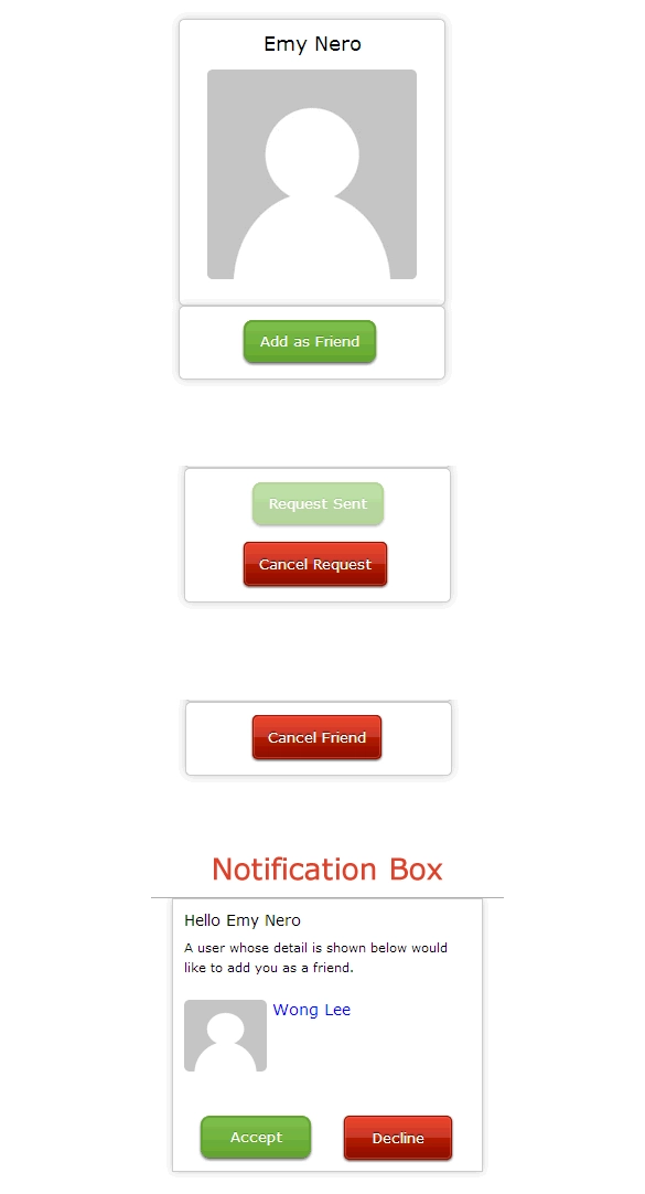 When a user sends a friend request by clicking on the Add as Friend button, this button will automatically change to Request Sent on successful sending of the request with an option to Cancel the sent request in case the user who sent the request wishes to stop the request.